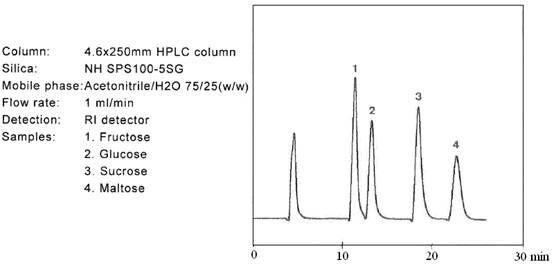 糖類的分離通常用到的是乙腈/水做流動相。當(dāng)乙腈的含量增加,保留因子k’增加。但是乙腈的含量需要仔細(xì)的控制,因為隨著乙腈含量的增加,樣品的溶解性會變差。