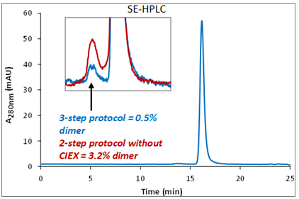 ? ? ? ?最終產(chǎn)品經(jīng)SE-HPLC檢測,純度高達99.5%,二聚體含量僅為0.5%,比Protein A - Desalting兩步層析所得產(chǎn)品的二聚體含量降低近6倍,該產(chǎn)品可直接用于氨基酸序列測定、二硫鍵測定以及糖型分析等高純度要求的檢測。