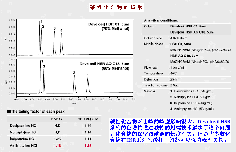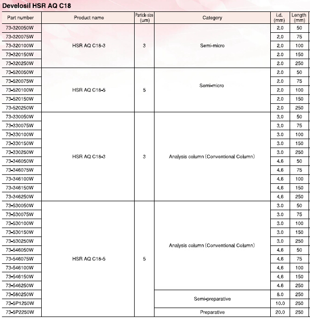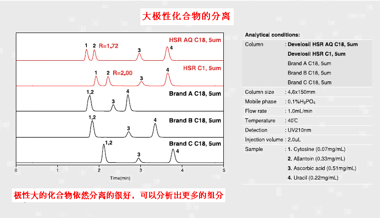 可以使保留和分離做到最大化,同時(shí)兼具耐久性和便捷性。這些特點(diǎn)可以廣泛的適用于科研研發(fā)和質(zhì)量控制。一般情況下,大極性的化合物使用HILIC模式的柱子,但是,我們可能更傾向于在分析的時(shí)候用類(lèi)似的反相柱。因此,Develosil HSR AQ C18和C1柱,應(yīng)運(yùn)而生!