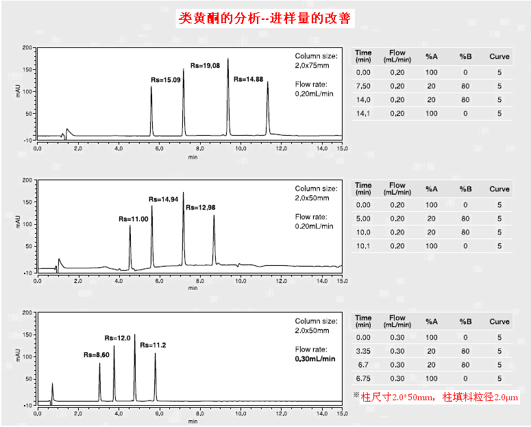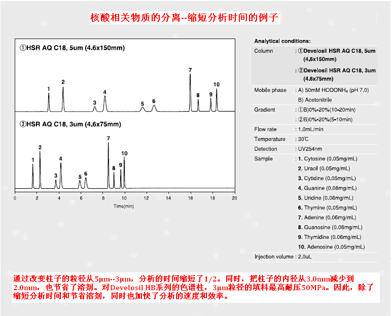 縮短分析時(shí)間可以幫助分析者提高工作效率。Develosil系列色譜柱會(huì)嚴(yán)格的控制填料的粒徑,所以通過(guò)縮小柱填料的粒徑,可以精準(zhǔn)的縮短分析時(shí)間。