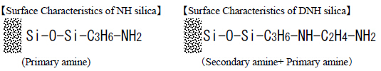 DNH硅膠鍵合的二元胺和一元胺是NH硅膠的2倍。基于這個原因,DNH硅膠的堿度要比NH硅膠強,并且由于碳鏈較長,DNH硅膠的氫鍵作用要比NH硅膠弱一些。因此,DNH硅膠的流動相要選擇極性小的溶劑,因為DNH硅膠的洗脫速度要比普通的裸硅膠和NH硅膠快。