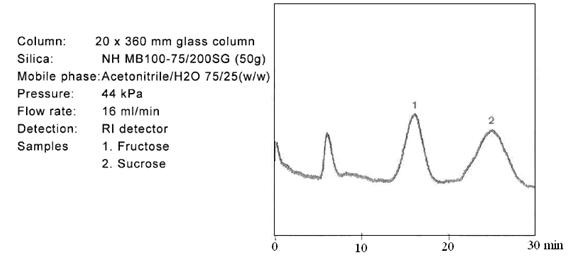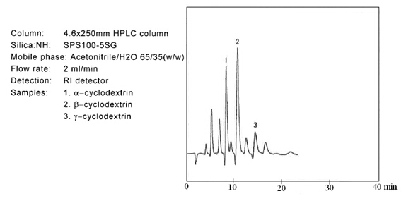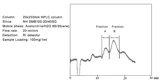 ? ? ? 糖類物質(zhì)的分析和制備,在液相色譜領(lǐng)域占有重要的地位。迄今為止,大多數(shù)的分離介質(zhì)僅僅局限在分析級別。但是富士硅膠研發(fā)出用于制備色譜的新的氨基硅膠。當使用高水相為流動相時,一般的氨基填料會暴露出很多問題。氨基硅膠的pH值很高,一般pH為9.0,在這樣高的pH條件下,目標化合物一般都會變性,并且會毀壞硅膠基質(zhì)的表面??紤]到這些問題,富士公司研發(fā)出新的氨基硅膠填料,稱之為NH SG硅膠。NH SG硅膠可以最小化甚至是避免上述問題,并且對糖類化合物進行更好的分離。