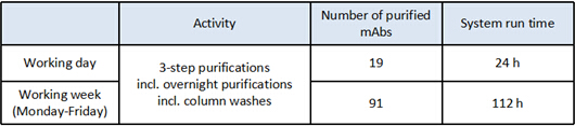 ??采用Protein A - CIEX - Desalting三步向?qū)K,每次上樣10 mL單抗上清液(1.0 mg/mL),每次產(chǎn)量均≥6.5 mg。單個(gè)樣品的純化耗時(shí)約為74 min,在24 h內(nèi)純化出多達(dá)19個(gè)樣品!而且該時(shí)間包含了層析柱的清洗環(huán)節(jié)。該系統(tǒng)持續(xù)運(yùn)行5天,純化樣品總數(shù)量高達(dá)91個(gè)。