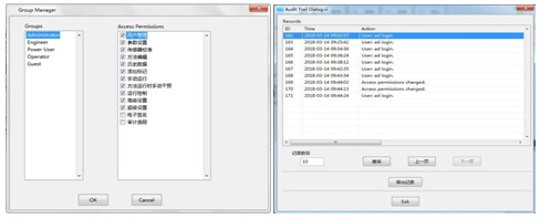 系統(tǒng)采用五級用戶管理權(quán)限,可對用戶權(quán)限進(jìn)行自定義分配,并可在運行中更換用戶(便于交接班)。完善的審計追蹤及電子簽名功能,符合cGMP法規(guī)要求。