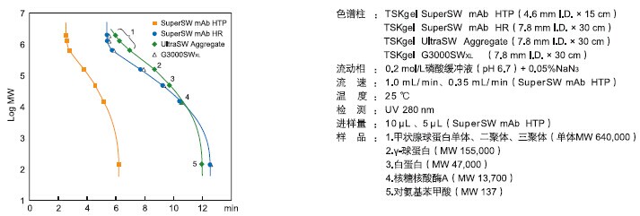 1. TSKgel SuperSW柱有內(nèi)徑為4μm的顆粒,能實(shí)現(xiàn)最高分辨率。窄至4.6mm內(nèi)徑的柱能在一定量的樣品質(zhì)量范圍內(nèi)提高高靈敏度。