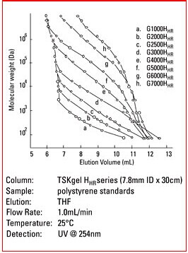 3. Hhr型色譜柱為常規(guī)的GPC色譜柱,尺寸為7.8mm ID x30cm。當使用此類常規(guī)色譜柱時,大多數(shù)的HPLC系統(tǒng)無需進行針對柱外峰展效應的優(yōu)化。