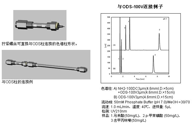 TSKgel NH2-100 DC 3μm 以鍵合了氨烷基的硅膠填料裝填了與后段的分析柱可以直接連接的色譜柱。不使用連接管也可連接2根色譜柱,可減少導(dǎo)致分離性能降低的死體積,2根分離模式不同的色譜柱的一體化,使用起來更方便。鍵合的氨基作為陰離子交換基發(fā)揮作用,協(xié)助完成后段色譜柱的分離,從而實現(xiàn)更好的分離成為可能。特別是與反相色譜柱的連接,醫(yī)藥品中的藥效成分和共存陰離子的同時分析成為可能。