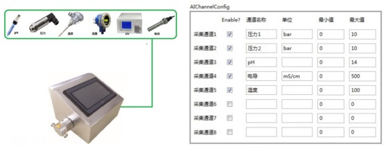 系統(tǒng)提供8路傳感器通道,可接受4~20mA及-10V~+10V的信號輸入,可連接絕大部分類型的傳感器,比如:壓力、溫度、流量、電導(dǎo)、pH、UV等。