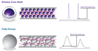 核-殼技術(shù)的奧秘在于核-殼顆粒的形狀。一致的多孔硅膠層圍繞著球形實心硅膠核生成:使用包含納米結(jié)構(gòu)技術(shù)的溶膠凝膠處理技術(shù),在固態(tài)硅膠核上培養(yǎng)出均一穩(wěn)定的多孔外殼,形成核-殼顆粒。該顆粒形態(tài)會產(chǎn)生比全多孔顆粒更小的譜帶展寬,從而帶來極高的柱效。