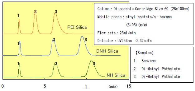 PEI硅膠鍵合的二元胺和三元胺是NH硅膠的3倍。基于這個(gè)原因,PEI硅膠的堿度要比NH硅膠強(qiáng),并且由于碳鏈較長(zhǎng),PEI硅膠的氫鍵作用要比NH硅膠弱一些。