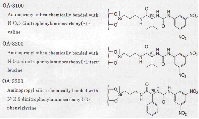 Pirkle改良型 氨基酸的萘乙胺衍生物 | OA-4000 | (S)-纈氨酸 (S)-1-(α-萘基)乙胺 | OA-4000R | 正相 |